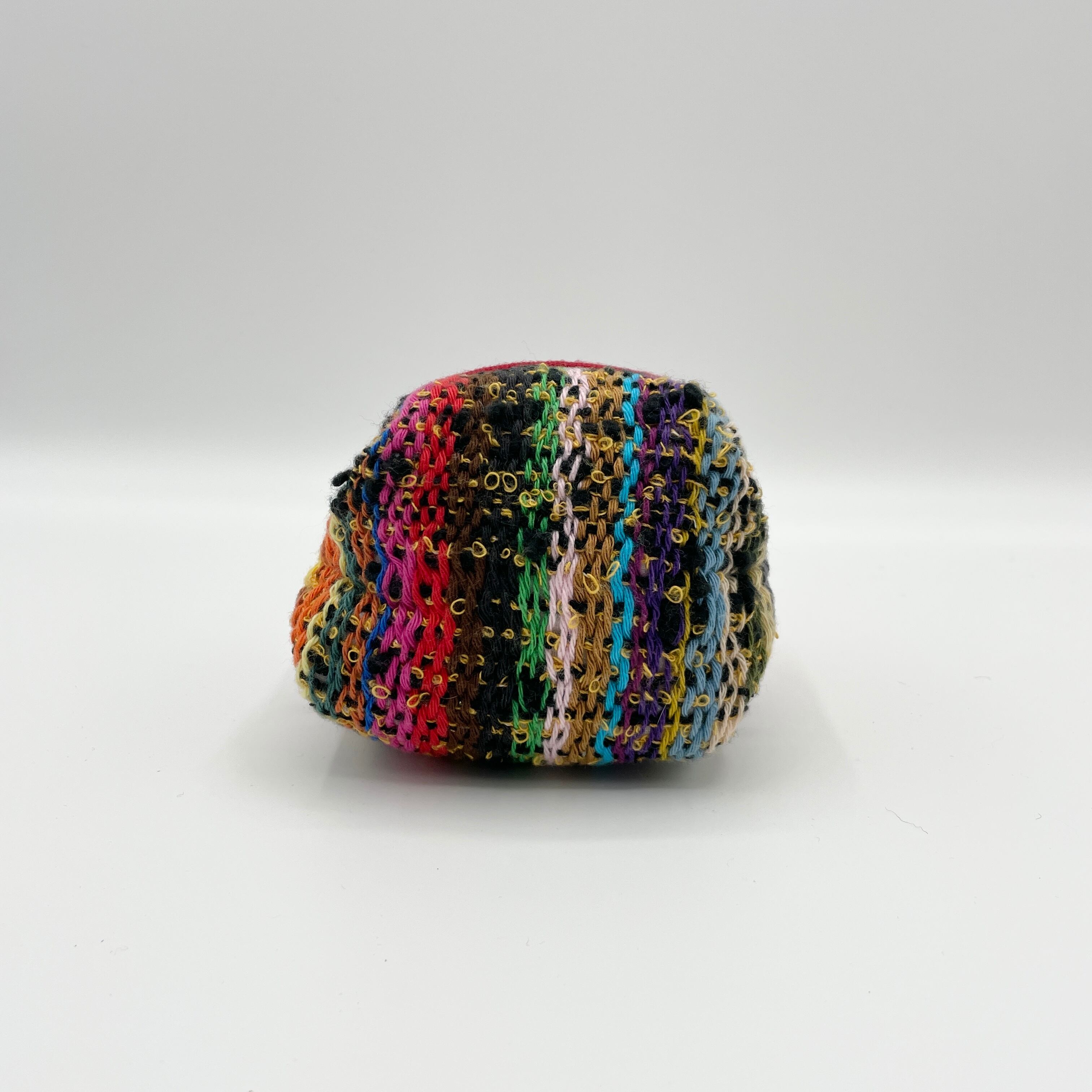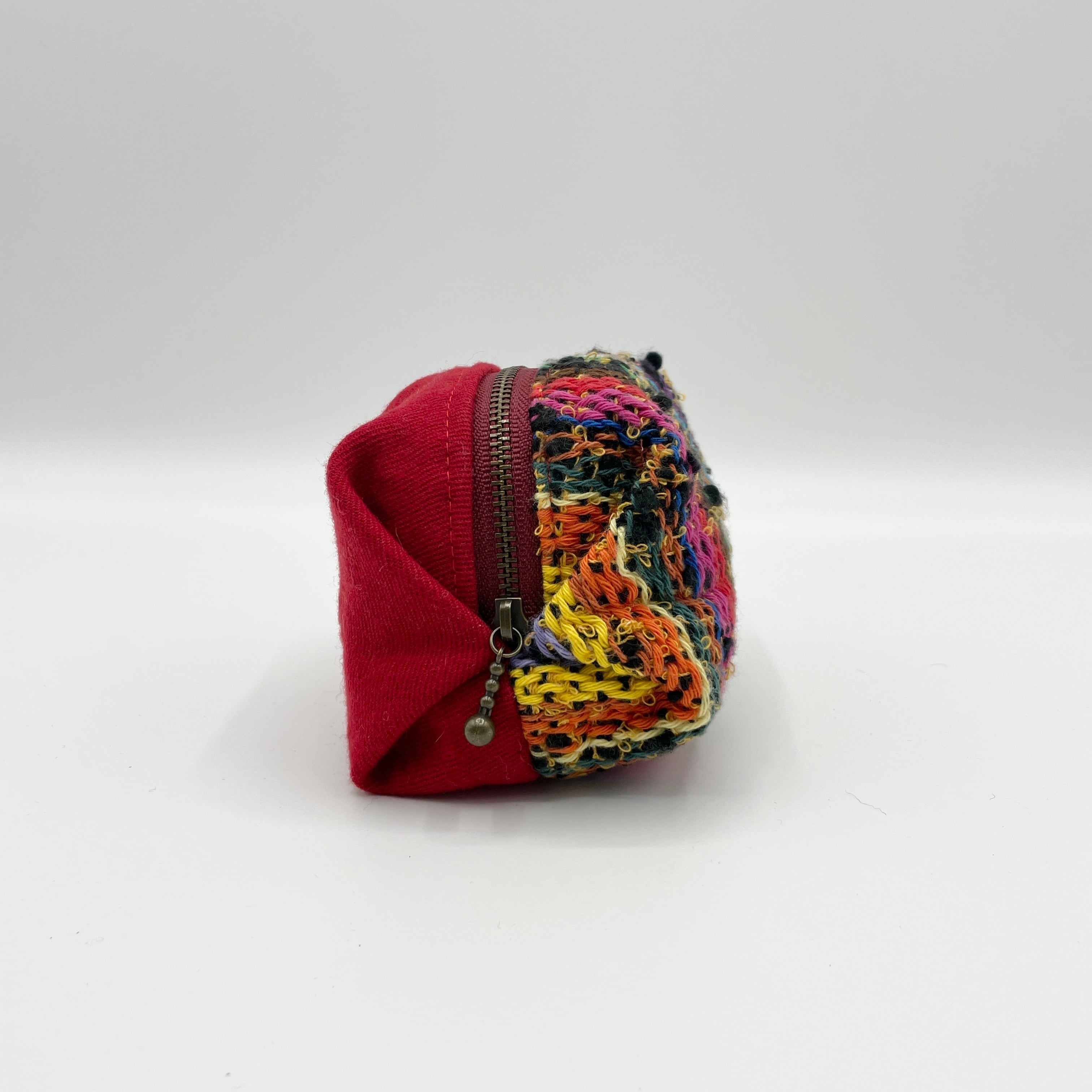 コロンとした可愛らしいポーチです。あまり大きくはないですが、ちょっとしたリップ等を入れるのに最適な大きさです。反物と普通の生地を組み合わせているためメリハリがあります。反物の使用の仕方も一つ一つ異なり個性が出ています。使用されている反物は全てかたるべのメンバーが織ったもので、一つとして同じ顔のないものとなっています。